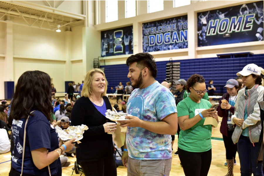 To start off the event, participants gathered in the Dugan Wellness Center for breakfast tacos and coffee as well as to participate in various activities put on by one of the Big Event’s biggest sponsors, Whataburger. After a rousing speech from President Quintanilla and a few words from a representative of Whataburger, participants dispersed to get the needed tools for whatever they were assigned to do.